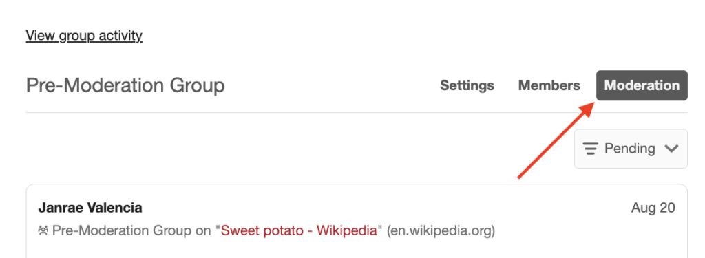 - Annotations can also be moderated from the moderation queue. The moderation queue can be accessed by going to the group activity page > Edit Group > Moderation.
