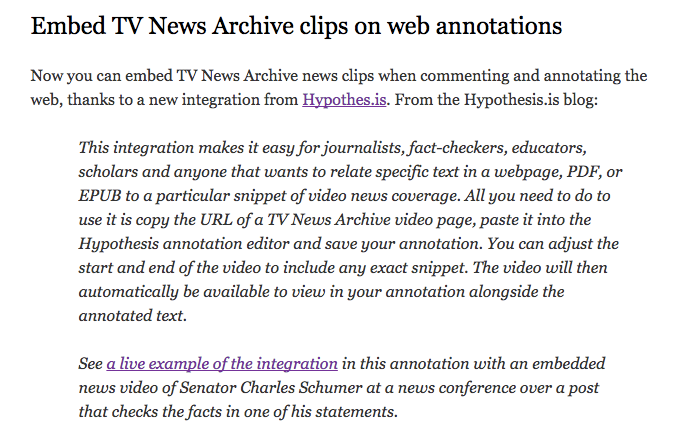 Now you can embed TV News Archive news clips when commenting and annotating the web, thanks to a new integration from Hypothes.is.
